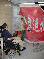 Once we collected my electric chair, and our luggage, we went to meet Joy who runs the only wheelchair accessible tour company in Beijing. We found her and her company ‘Access Travel’ on the Internet (http://www.access-travel.cn/index.htm) a few months ago before we left Salt Lake. She helped to set out an itinerary for the coming days in Beijing. While we were loading the luggage into the wheelchair accessible van (which was much more like a bus) we got to know more about her and our tour guide who took the English name "Andy"(see photo below: Andy, Joseph and Joy).